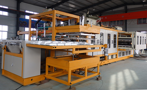 本公司研制開發(fā)的自動成型裁斷一體機(jī)是一種全能型的熱成型裁斷機(jī)組,以真空成型為主,兼壓空成型、模壓成型及綜合成型,可加工多種熱成型塑料片材。機(jī)組采用全電腦PLC控制,具有結(jié)構(gòu)先進(jìn),性能穩(wěn)定,易操作,產(chǎn)量高,成型面積大,自動化程度高等特點。本機(jī)主要用于成型PSP材料,用于食品餐盒、托盤、碗、杯等各式包裝制品。本設(shè)備的最大優(yōu)點是集成型裁斷一體。生產(chǎn)出的成品直接堆垛收集。本設(shè)備在生產(chǎn)過程中除了節(jié)能降耗等優(yōu)點外,還大大節(jié)省了工作面積、生產(chǎn)時間和勞動力的支出。